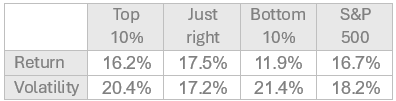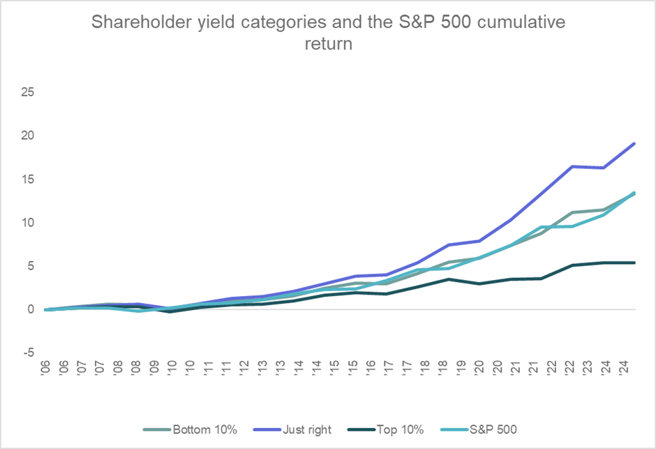 Evaluating the US S&P 500 over the past 20 years shows that if you exclude the top and bottom 20% of shareholder yield companies, the “goldilocks zone” outperforms the index by 0.9% per annum with lower volatility.