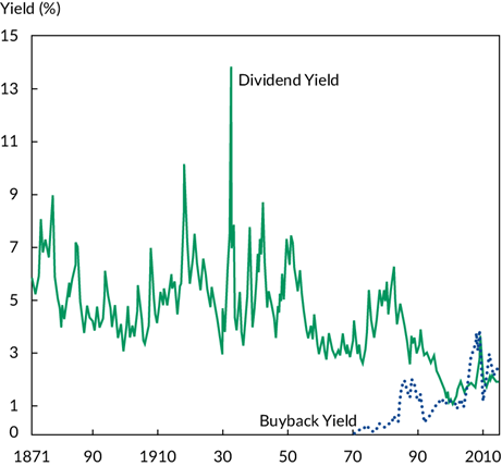 The graph below illustrates the historical comparison between dividend yield (green) and buyback yield (blue) from 1871 to 2014 (research by Philip U. Straehl and Roger G. Ibbotson, in their study “The Long-Run Drivers of Stock Returns: Total Payouts and the Real Economy.”).